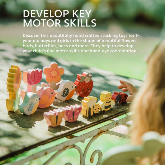 Et fargerikt og fantasifullt stable- og balanseringsspill med blomster, bier, fugler, sommerfugler og marihøner. Perfekt for små hender og store eventyr! Hver del er laget av solid, bærekraftig treverk og malt med vannbasert, giftfri maling. En morsom og lærerik måte å utvikle finmotorikk, balanse og kreativitet.