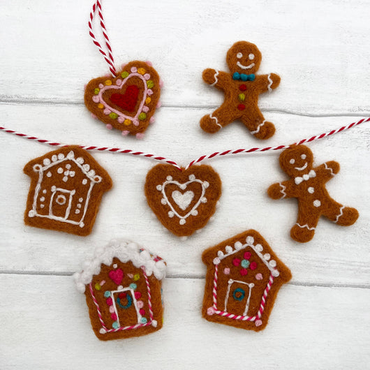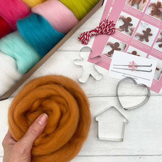 Make at least SEVEN needle felted gingerbread style decorations with this beginners’ needle-felting kit. The kit includes THREE metal cookie cutters so that you can felt the perfect gingerbread-style shapes every time! String them into a garland or add hanging loops and hang them on your Christmas tree.