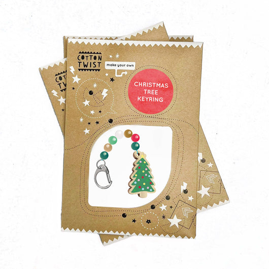 Settet inneholder alt du trenger: et juletre, fargerike trekuler, nøkkelringlenke og elastisk tråd med metallender som gjør det enkelt å tre perlene – også for små hender.