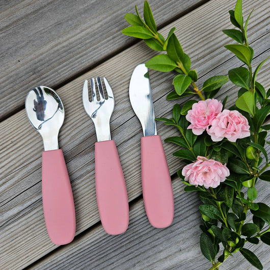 Et slitesterkt og lett håndterlig barnebestikk i rustfritt stål og myk silikon, perfekt tilpasset små hender. Settet inneholder gaffel, kniv og skje – ideelt for barn som skal lære å spise selv.