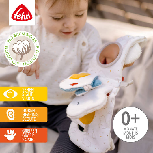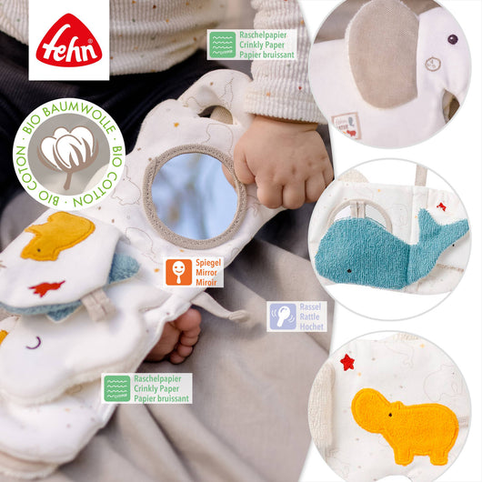 Den myke tekstilboken fra FehnNatur®-kolleksjonen inviterer de minste til å oppdage, utforske og sanse. Med motiver som elefant, solspeil, trær, regnbue, skyer, måne og hus, blir den en liten verden av opplevelser for barnet. Integrerte lekefunksjoner som knitrepapir, speil og pipelyd stimulerer berøringssansen, hånd-øye-koordinasjon og selvoppfatning. De ulike strukturene på hver side gir ekstra mye glede når barnet blar, kjenner og undersøker. Perfekt både hjemme og på farten!