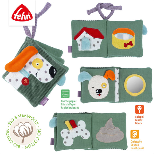 Den myke tekstilboken fra FehnNatur®-kolleksjonen inviterer de minste til å oppdage, utforske og sanse. Med motiver som hund, solspeil, trær, regnbue, skyer, måne og hus, blir den en liten verden av opplevelser for barnet. Integrerte lekefunksjoner som knitrepapir, speil og pipelyd stimulerer berøringssansen, hånd-øye-koordinasjon og selvoppfatning. De ulike strukturene på hver side gir ekstra mye glede når barnet blar, kjenner og undersøker. Perfekt både hjemme og på farten!