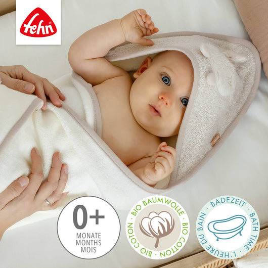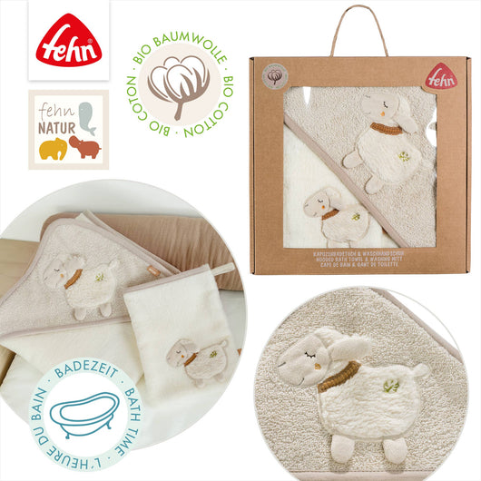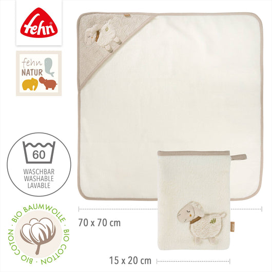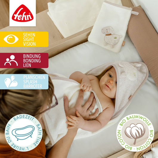 Animal bathing fun — the absorbent bath set consisting of a hooded towel and sheep wash mitt from the FehnNatur® sheep collection makes daily washing fun for every baby.