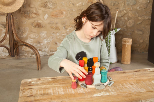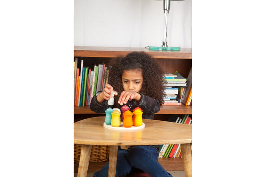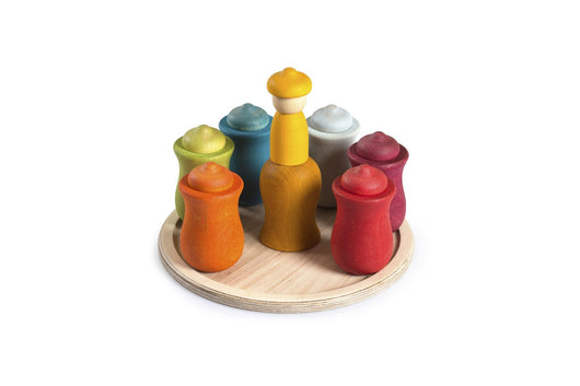 Den inneholder 7 Nins-eikenøtter i 7 farger som er knyttet til ukens dager i tråd med Waldorf-pedagogikken, 7 beholdere og 1 rundt fat (18 cm i diameter) som rommer alle delene.