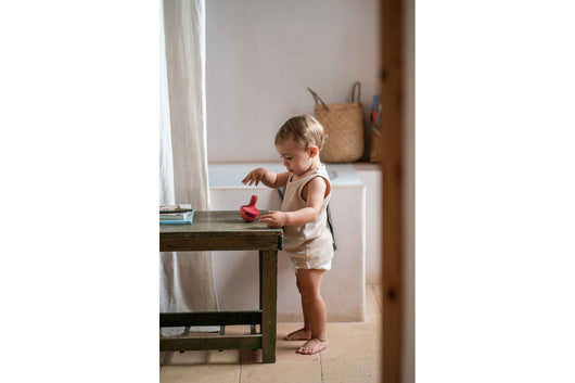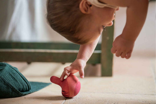 Bli med den rosa fuglen på tur. Med sine rosa fjær og tydelige vinger kan den snurres og rulles bortover. Barn kan se den rotere, svinge og rase avgårde, og utforske bevegelse med hendene.