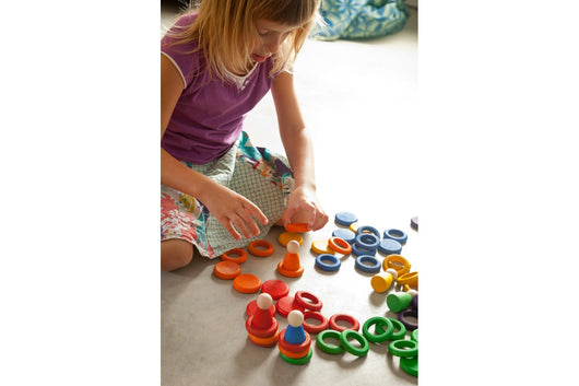 Den inneholder 6 Nins, 36 ringer og 18 mynter i regnbuens farger. Det følger med en tekstilpose i stoff med GOTS-sertifikat.