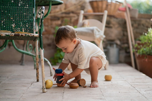 Laget i solid tre og farget med naturlige pigmenter, er dette en håndlaget leke som støtter kreativitet, sortering, bygging og åpen lek. En fri og utforskende lekeopplevelse der barnet selv bestemmer hva det blir.
