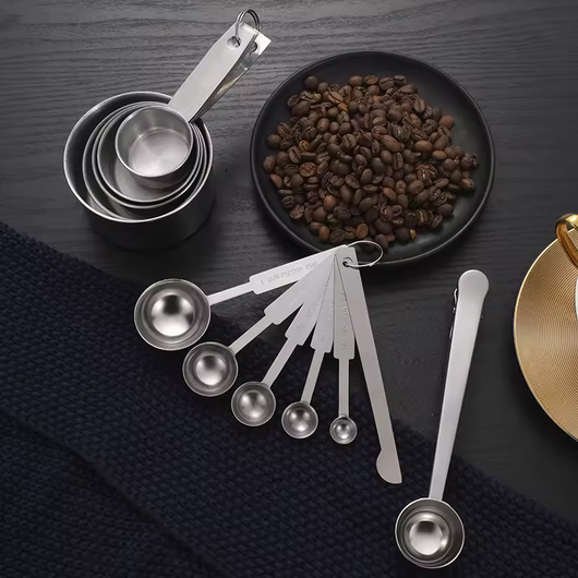 Observera: bilden visar en uppsättning mätkoppar och en uppsättning mätskedar. Det sålda objektet är bara uppsättningen mätskedar.