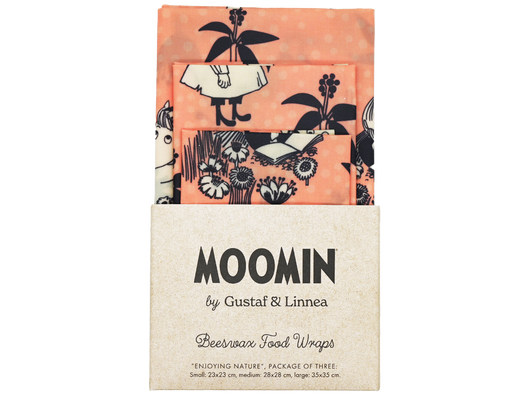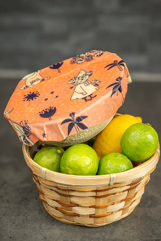 Disse bivoksarkene med motiver fra Mummidalen er et nydelig og naturlig alternativ til plastfolie. Bruk den rundt ost, grønnsaker, frukt eller en restemiddag – og form den enkelt rundt maten eller fatet med hendene. Når voksen varmes lett opp, tilpasser den seg formen og holder seg på plass.