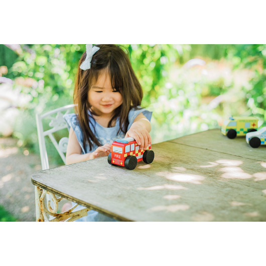 Brannbil i tre, perfekt for fantasifull lek og for å la barna utforske redningstjenestens spennende verden. Den solide utformingen gjør den lett for små hender å gripe og skyve, og den bidrar til å utvikle både motorikk og koordinasjon.