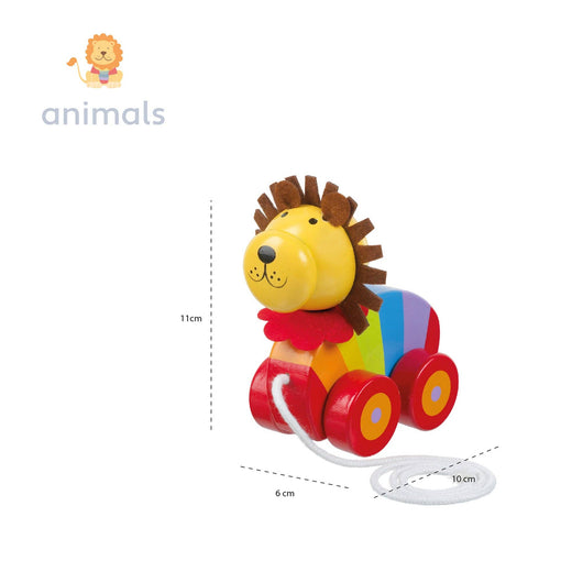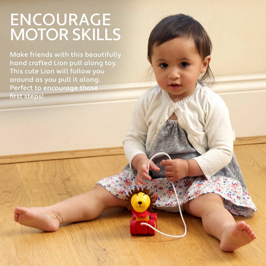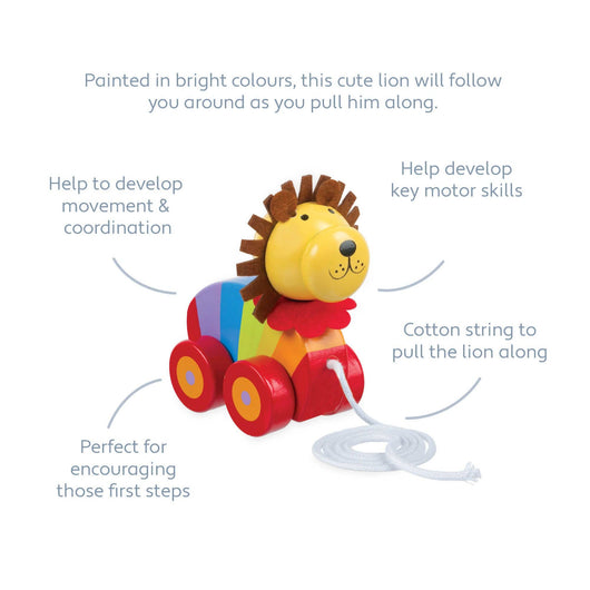 Bli venn med denne nydelige treleken – en løve på snor! Malt i klare, fine farger vil denne søte løven trofast følge etter når barnet drar den bortover gulvet. Perfekt for å oppmuntre til de aller første skrittene. 🦁