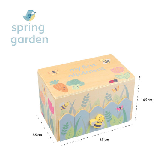 Det glidende lokket fungerer som espalier der barnet kan plante magnetiske tomater og jordbær, og i blomsterbedet kan de så solsikker og tulipaner. Den nederste boksen kan trekkes ut og bli til en grønnsakshage med brokkoli, gulrøtter og rødbeter. Når leken er over, pakkes alt pent sammen med nedfellbare rabatter og skyvelokk som holder alle delene på plass.