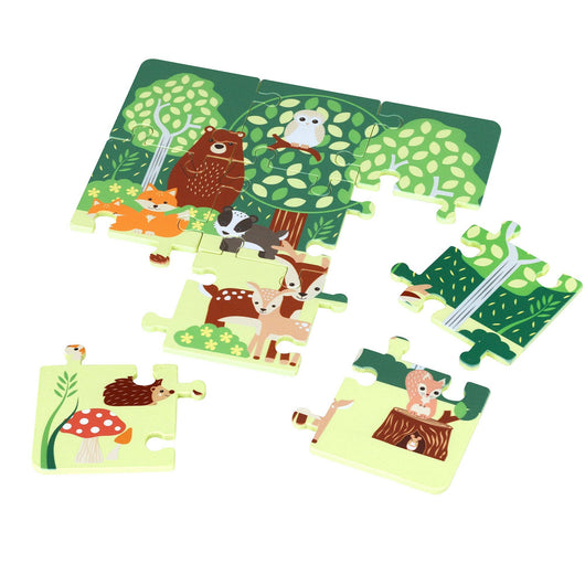 Et vakkert puslespill i tre med 9 biter som til sammen danner en koselig skogsbilvei med ulike dyr. De robuste trebitene er perfekte for små hender å gripe og sette sammen, og puslespillet er akkurat passe utfordrende for de minste.