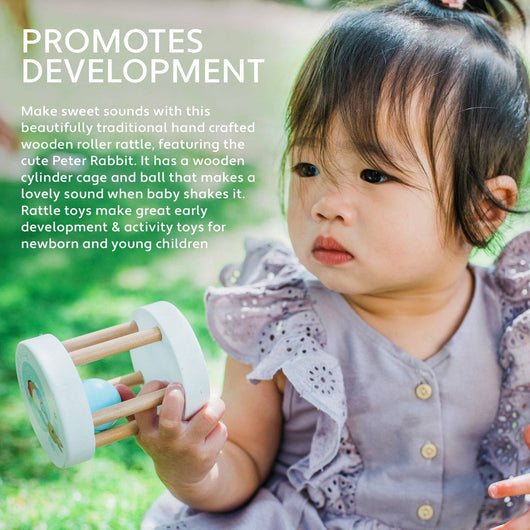 En herlig Peter Rabbit™ rangle som gir små barn sanserik lek, lyd og bevegelse! Når barnet dytter eller ruller den, lager den myke, spennende raslelyder som fanger oppmerksomheten og stimulerer til utforskning. Det søte Peter Rabbit™-designet gjør den til en tidløs favoritt – perfekt for små hender og tidlig utvikling av motorikk og sanser.