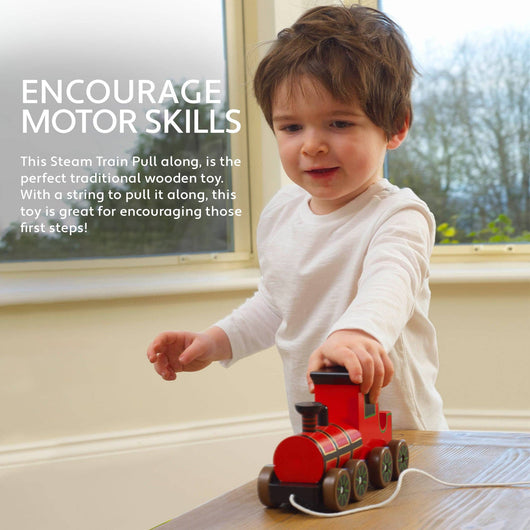 Et klassisk damplokomotiv i tre fra Orange Tree Toys’ Vintage Collection. Leken er håndmalt i varme rødfarger med fine detaljer. Med snoren foran kan barnet enkelt dra lokomotivet etter seg mens det ruller jevnt