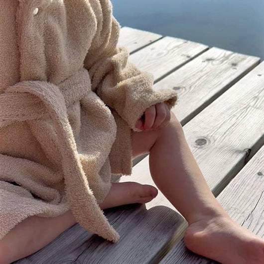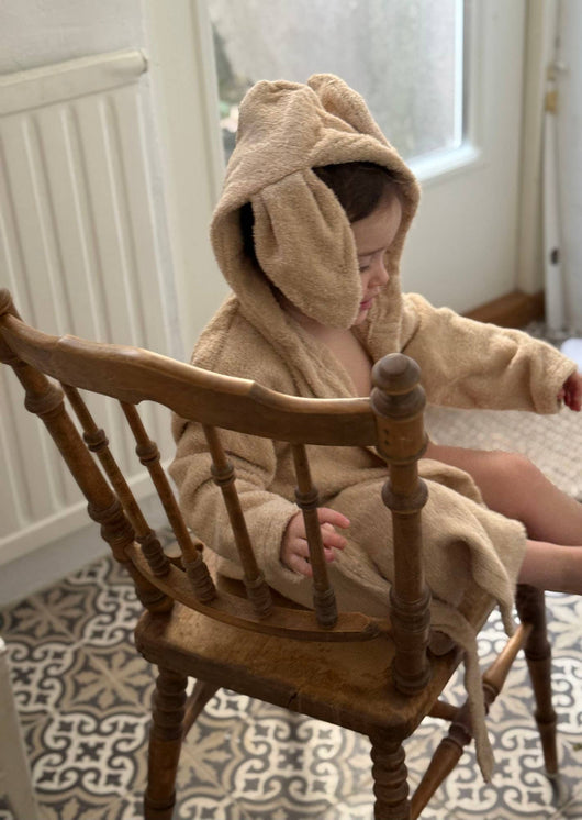 Myk badekåpe i 100 % økologisk bomullsfrotté med kaninører – like fin etter kveldsbadet som på stranda i ferien.