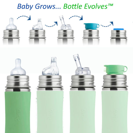 Puras filosofi «One life… One bottle™» og «Baby grows… bottle evolves™» handler nettopp om dette: kjøp én solid flaske, og bytt bare topp når behovene endrer seg – fra baby til barnehage, skole og voksenliv.