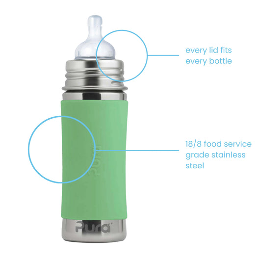 Pura kombinerer 18/8 rustfritt stål (det mest hygieniske materialet tilgjengelig) med medisinsk silikon – og ingenting annet. Resultatet er holdbare, lette og ekte plastfrie flasker uten belegg eller linere på innsiden, der alle flasker passer med alle topper. Fra nyfødt til voksen kan én flaske følge med i mange år: Bytt bare til den silikon-toppen som passer behovet akkurat nå.