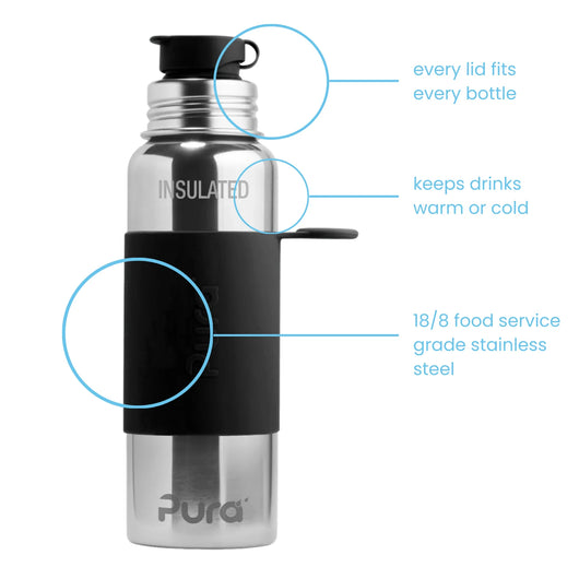 Pura kombinerer 18/8 rustfritt stål (det mest hygieniske materialet tilgjengelig) med medisinsk silikon – og ingenting annet. Resultatet er holdbare, lette og ekte plastfrie flasker uten belegg eller linere på innsiden, der alle flasker passer med alle topper. Fra nyfødt til voksen kan én flaske følge med i mange år: Bytt bare til den silikon-toppen som passer behovet akkurat nå.
