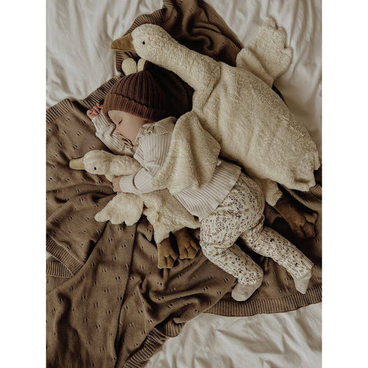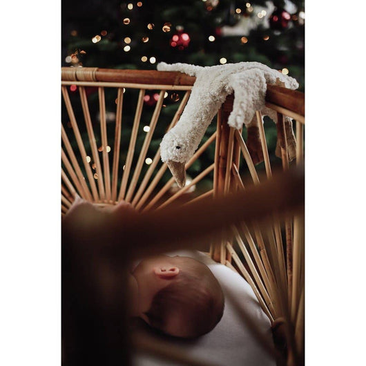Hver gås er håndlaget i Europa av GOTS-sertifiserte naturmaterialer, helt uten plast og syntetiske fibre. Dette er en kosebamse laget med omtanke – skapt for å vare, elskes og bli en verdifull del av barndommen. En gave med sjel, varme og varighet, laget for barn som trenger noe godt og mykt å holde rundt.