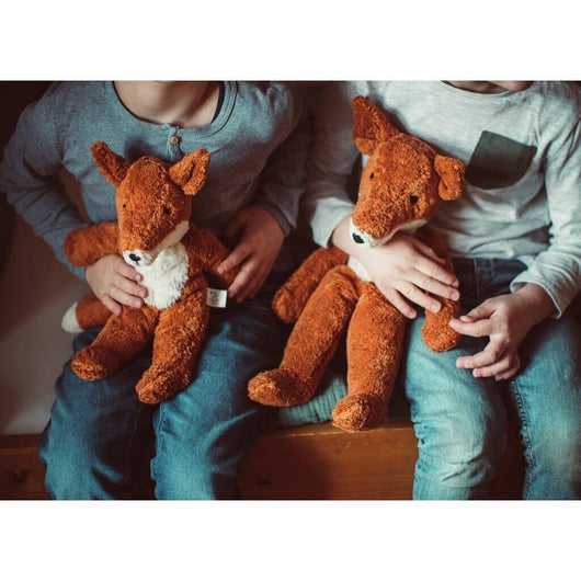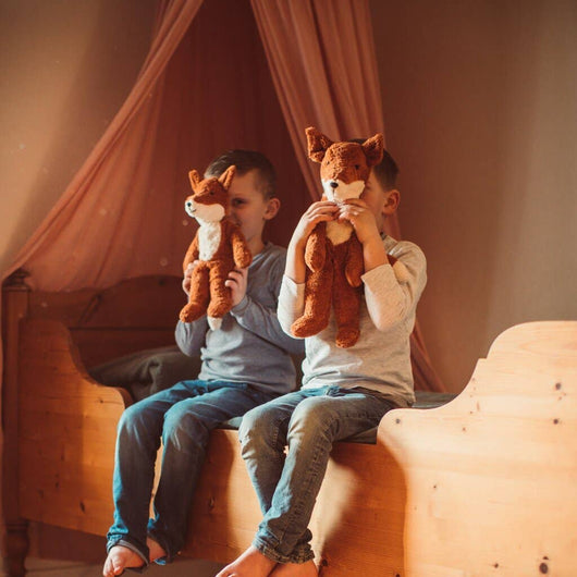Den rustrøde pelsen og det milde uttrykket gir en naturlig og trygg tilstedeværelse i både seng, stue og barnerom. Reven er håndlaget i Europa av GOTS-sertifiserte naturmaterialer, helt uten plast og syntetiske fibre. Fyllet av saueull gjør den ekstra pustende og trygg for barn i alle aldre.