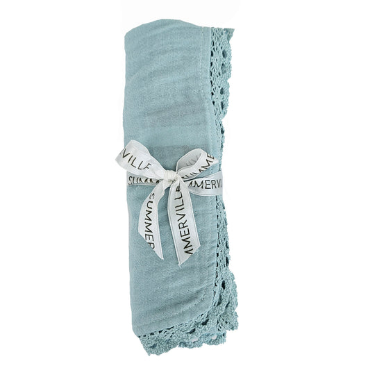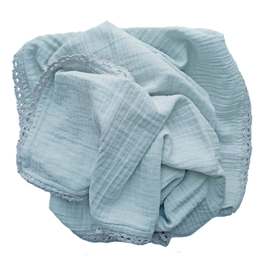 Et ekstra stort og mykt musselinteppe i økologisk bomull Den luftige musselinstrukturen og den fine blondekanten gjør teppet både praktisk og nydelig i bruk – perfekt i vognen, sengen, babynest eller som kose-/svøpeteppet.
