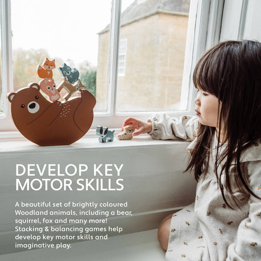 Stable alle skogsdyrene så høyt du klarer! Dette stable- og balanseringssettet byr på fantasifull lek og hjelper barnet med å utvikle koordinasjon og finmotorikk.