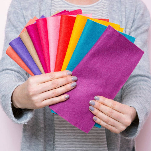 We have curated a fantastic range on 13 colour palettes for you to choose from. Each bundle comes with 10 sheets of beautiful wool blended felt measuring approximately 22.5 cm square.